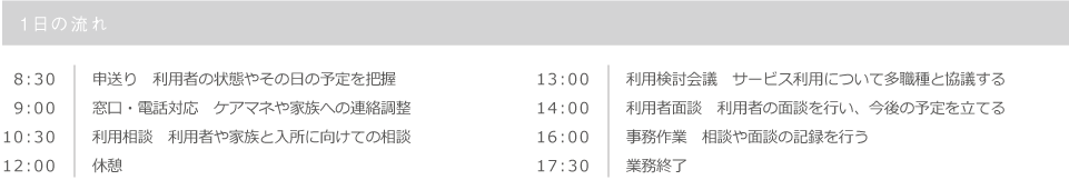 | 相談に来られる方は何らかの悩みや不安を抱えています。その悩みや不安を解決できるように、また利用者・家族のこれからの人生において、「私に何できるのか」を日々考えながら働いています。利用者・家族や地域社会に「あなたに相談して良かった」と思われるような相談員であり続けたいと考えます。今後も様々な経験を積み、私自身の成長やステップアップにもつなげていきたいと思います。 | ![]() |